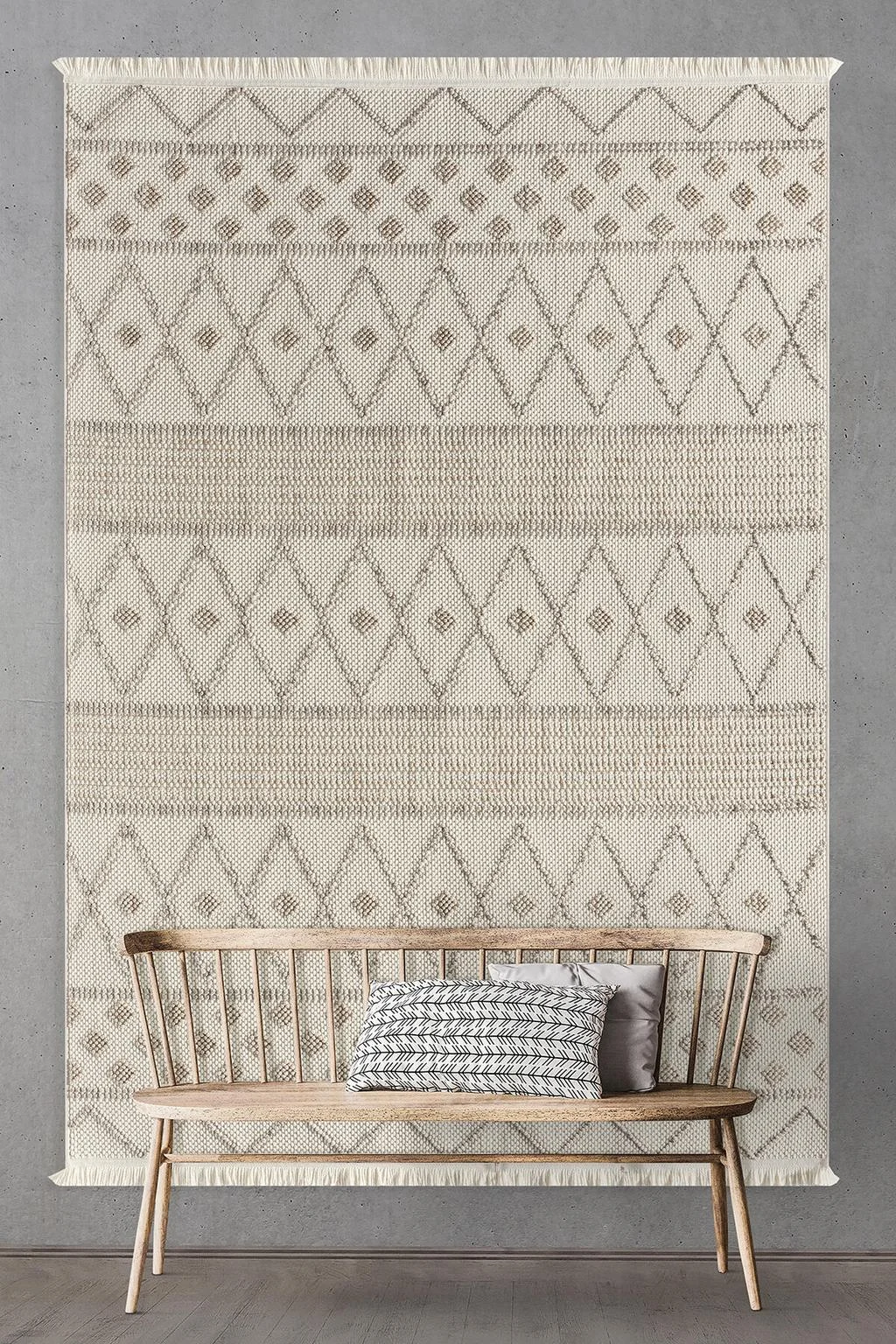 İpliği polyesterdir, taban malzemesi %100 pamuktur. Geometrik deseni ile halı modası evinize gelir, modern ve İskandinav tarzı mobilyalar ile uyumludur. Oturma odası, yatak odası, antre, hol, mutfak kullanımına uygundur. Yerden ısıtmalı alanlarda kullanılabilir. Taban yalıtımına katkı sağlar. *Pamuk tabanlı halıların en veya boylarında %3 kısalma görülebilir. *Hav Yüksekliği/Kalınlık: 7 mm